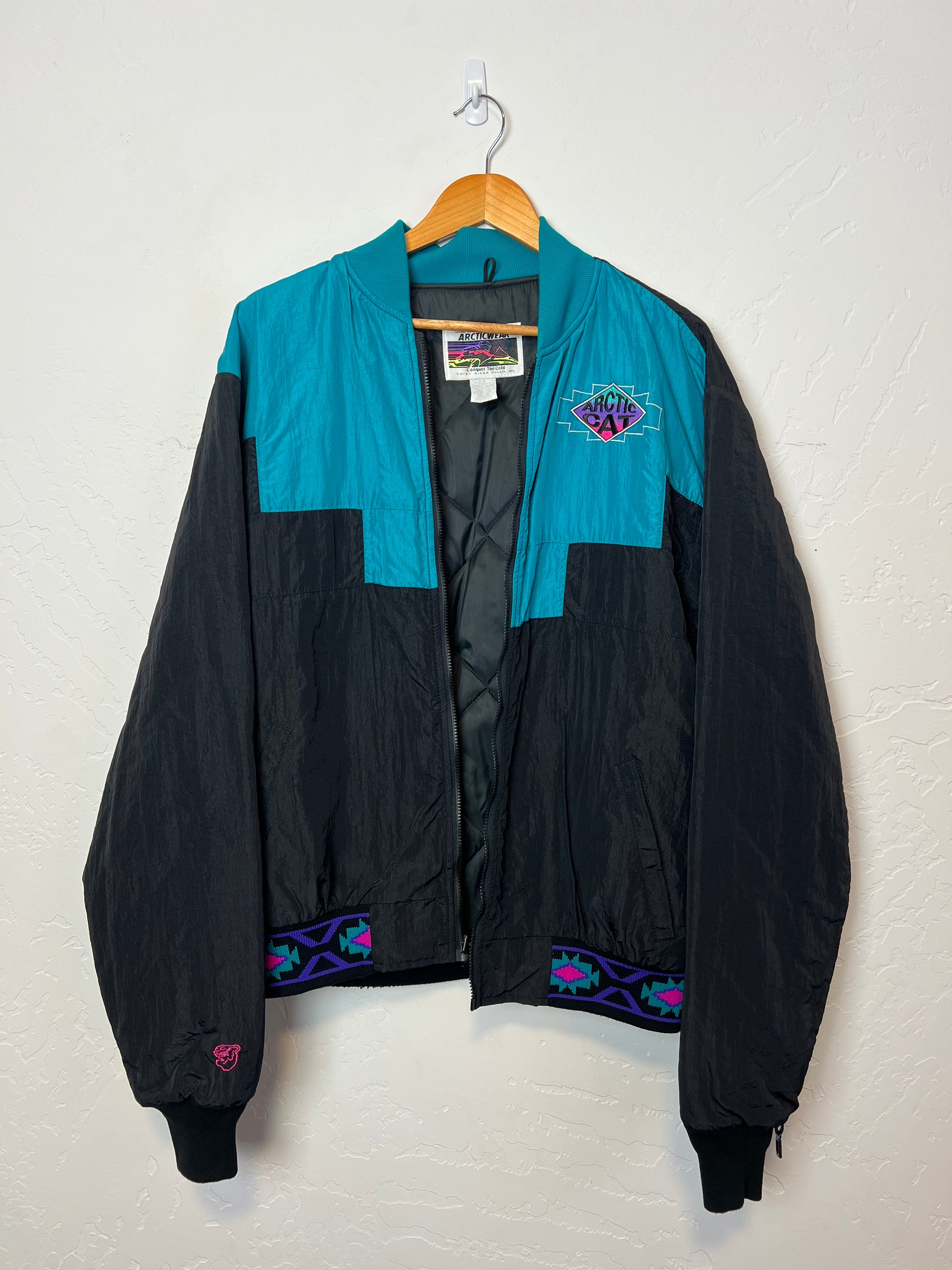 A bold vintage Arcticwear puffer jacket featuring vibrant purple, teal, and black colorblocking with distinctive Southwestern-inspired trim. Made in Thief River Falls, Minnesota - the heart of snowmobile country.