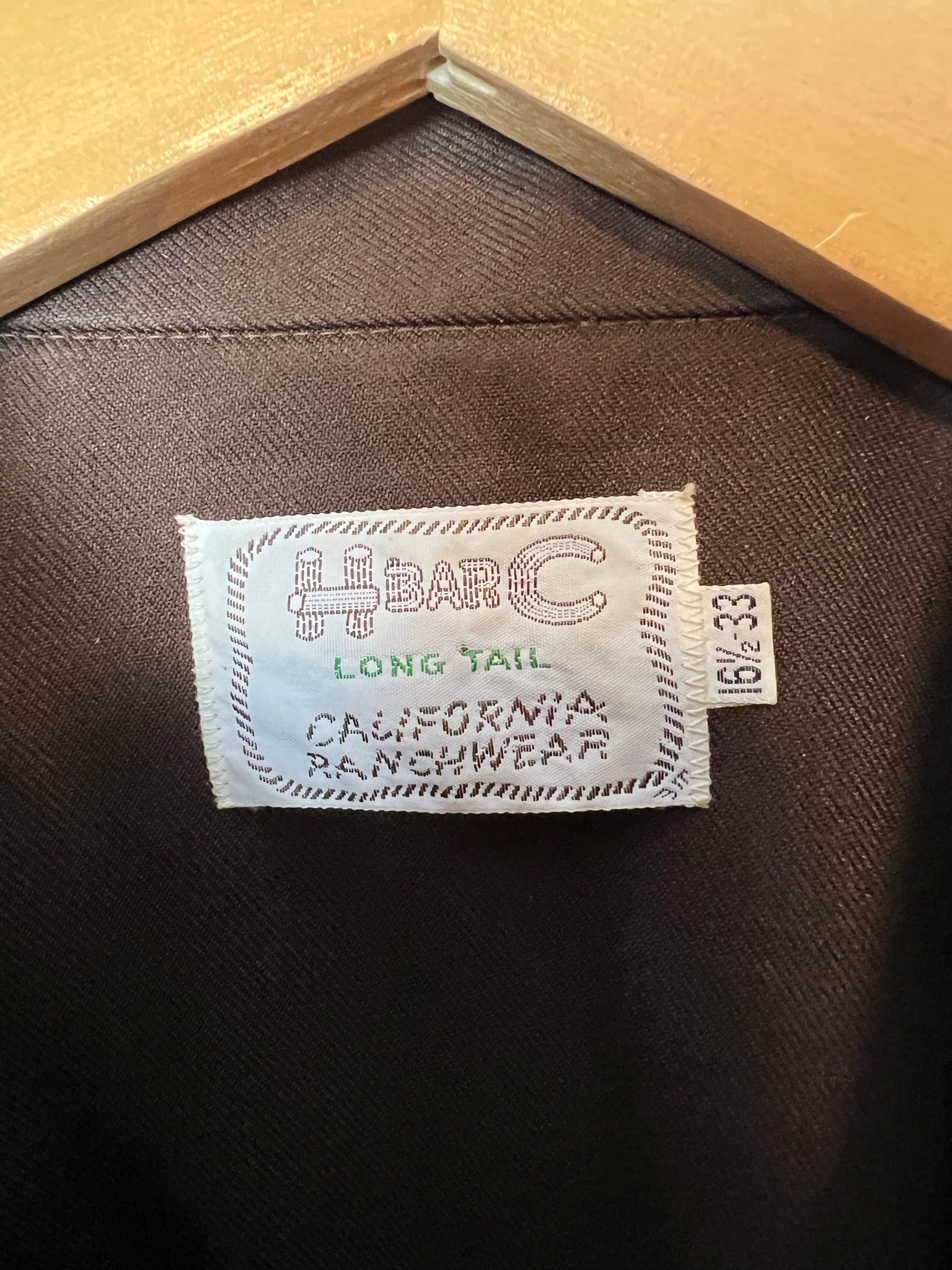 An authentic brown Western shirt from H Bar C California Ranchwear in the coveted "Long Tail" style. This classic piece features genuine pearl snap buttons and arrow-shaped pocket flaps, embodying the timeless style of the American West that made H Bar C a legend in Western fashion.