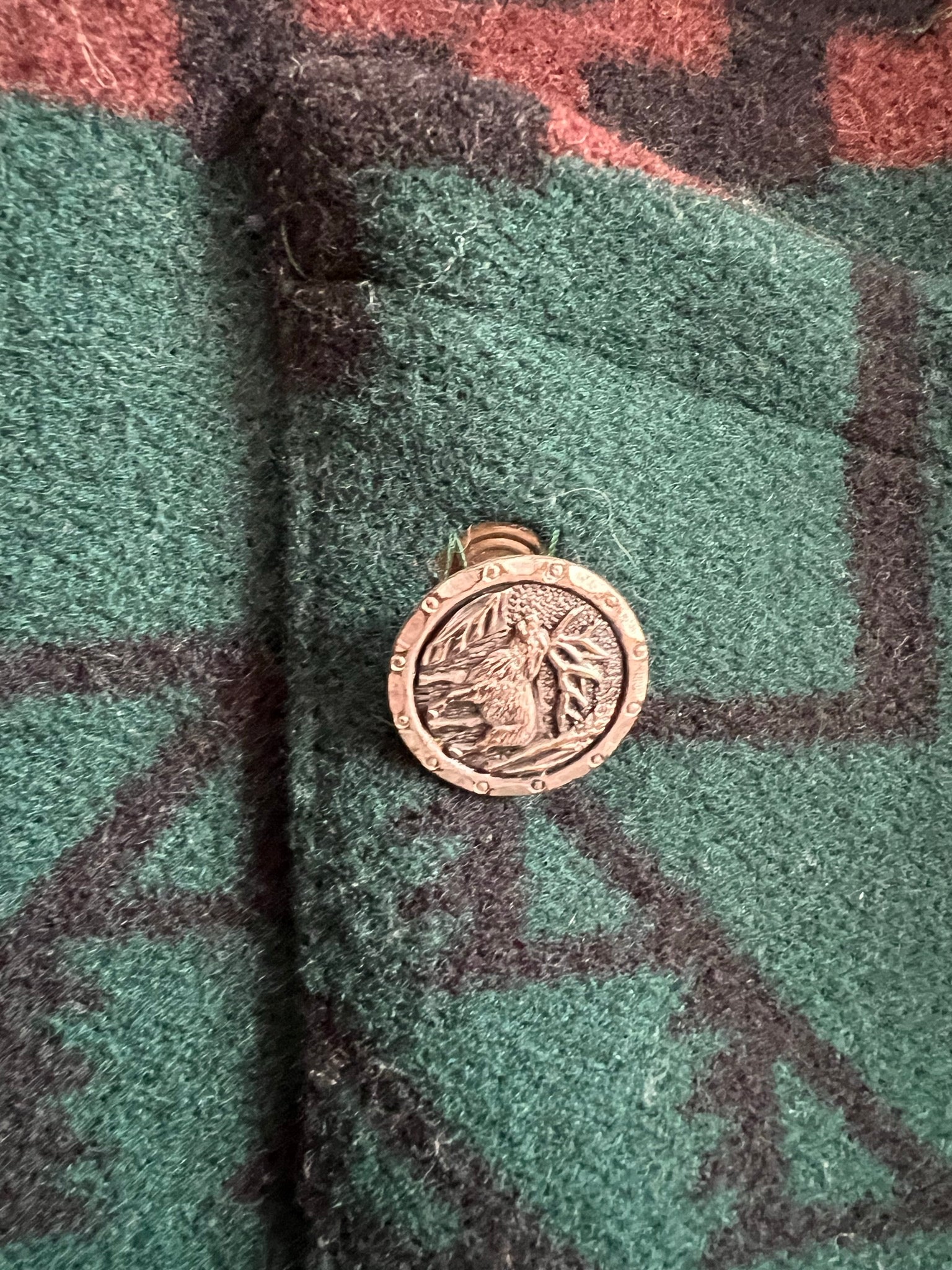 A stunning example of Pendleton craftsmanship, this High Grade Western Wear jacket features a bold southwestern geometric pattern in rich teals, browns, and reds. Made in the USA with premium wool blend fabric.
